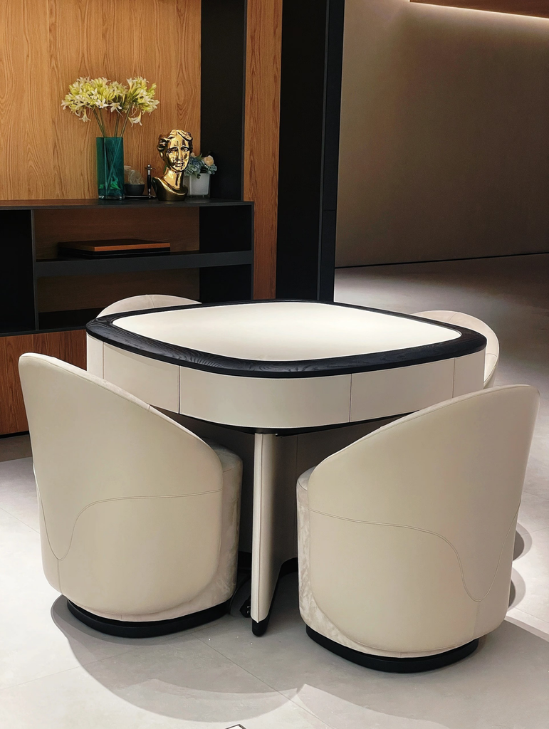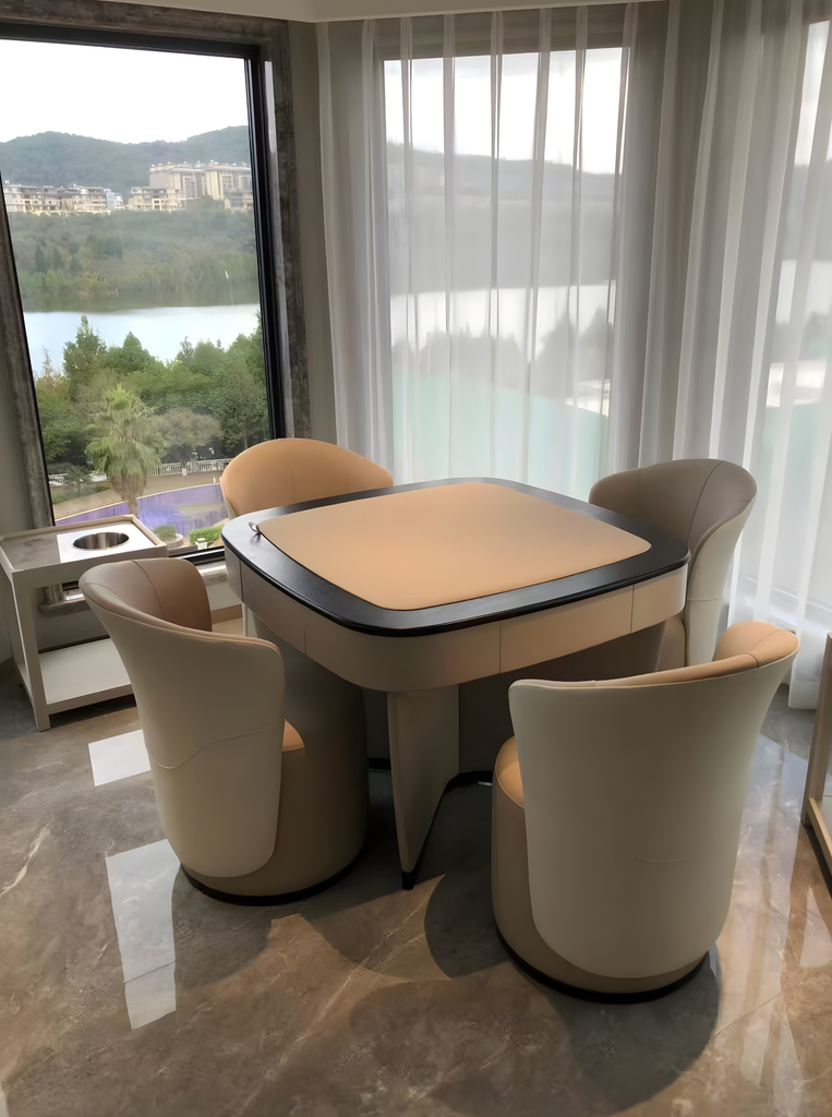 The Flamingo Home Design Lux Automatic Mahjong Table is designed to seamlessly blend into modern luxury interiors. With its soft rounded silhouette, warm neutral tones, and refined wooden frame cover, this table looks like an elegant furniture piece—while delivering the performance of a professional automatic mahjong system.